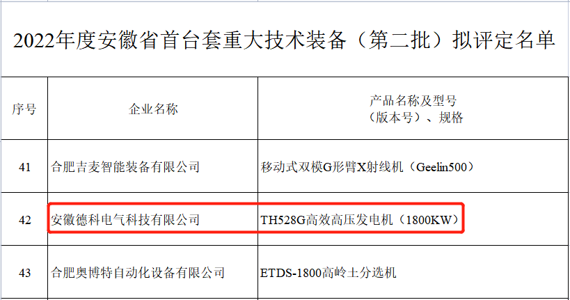 为鼓励和支持首台套重大技术装备的研制和应用,加快我省装备制造业转型升级,推动制造强省建设,根据《安徽省经济和信息化厅关于印发<安徽省首台套重大技术装备首批次新材料首版次软件评定管理暂行办法>的通知》,经企业申报、所在市经信主管部门审核推荐、第三方评定机构组织专家评审、公示等程序,评定德科TH528G高压高效发电机等116套装备为2022年安徽省第二批首台套重大技术装备。