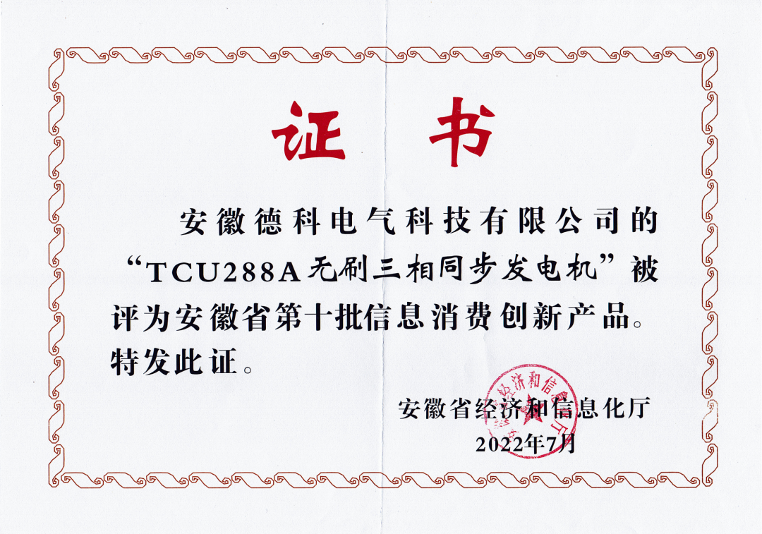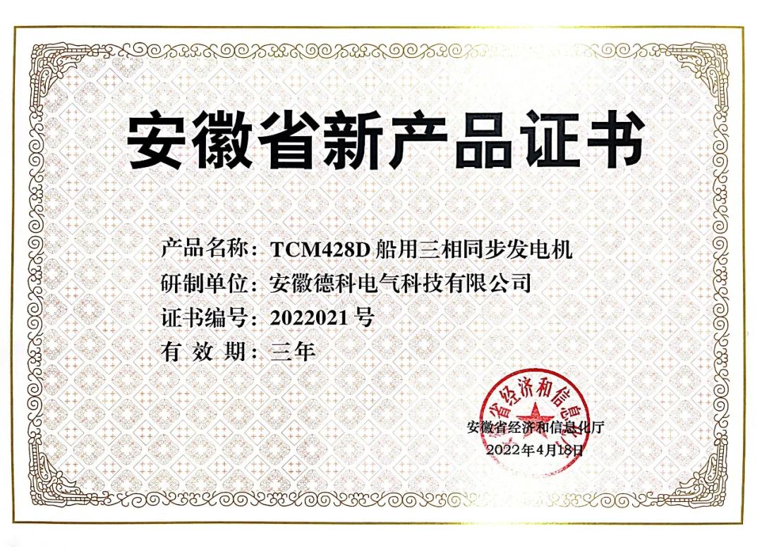 根据《安徽省新产品认定暂行办法》(皖经信科技函120171880号),安徽省经济和信息化厅组织开展了2022年第一批安徽省新产品认定工作。经专家评审,认定安徽德科电气科技有限公司〝TCM428D船用发电机〞 等113项产品为2022年度安徽省新产品。